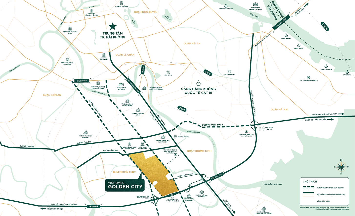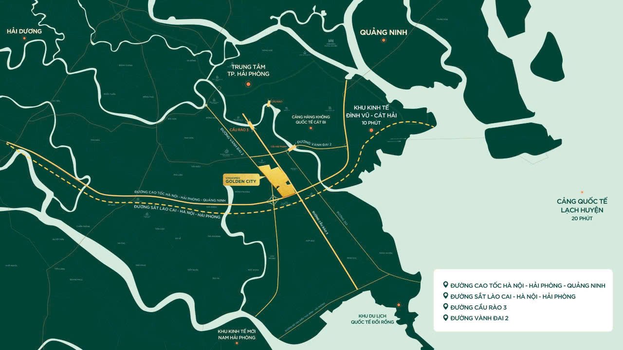 Tọa lạc tại vị trí cửa ngõ chiến lược, dự án mở ra chuẩn sống hiện đại, sinh thái và giao thương sôi động. Là biểu tượng mới của chất sống “kim cảng” hào hoa, Vinhomes Golden City góp phần hiện thực hoá tầm nhìn đưa Hải Phòng vươn ra quốc tế.